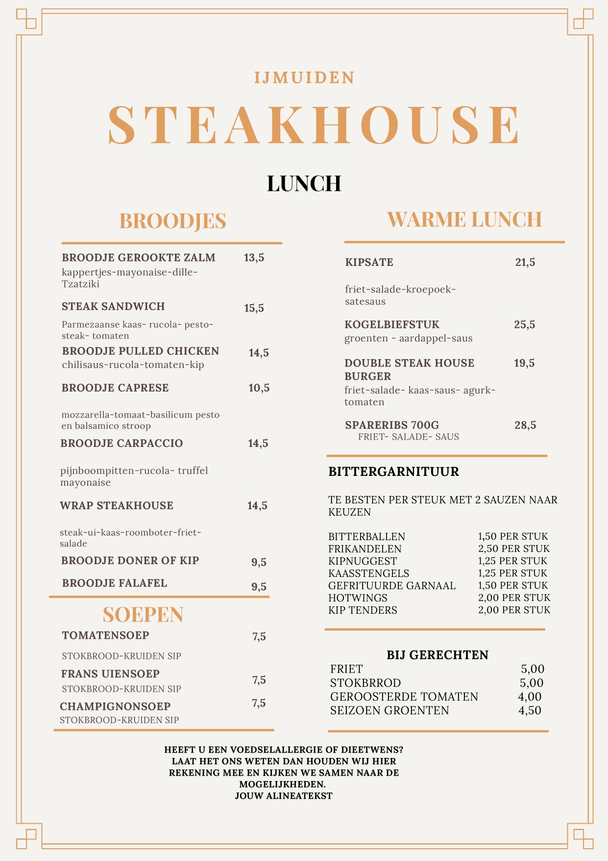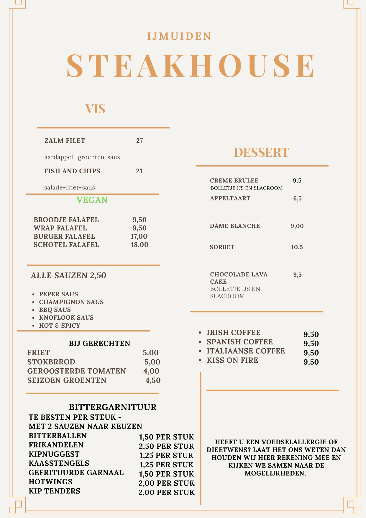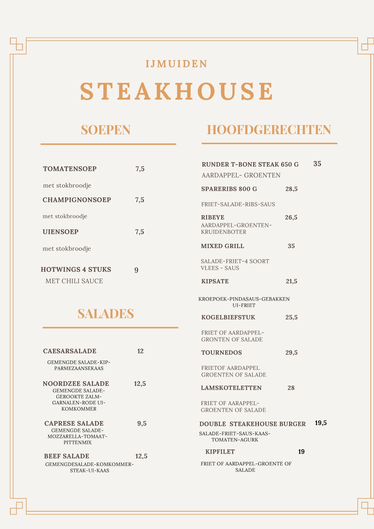 Waar elke hap een culinaire ervaring is. Onze ambachtelijk bereide steaks zijn vers van de grill en bieden een unieke smaakbeleving. Van mals tot sappig, onze premium vleesselectie zal uw smaakpapillen verwennen. Naast onze heerlijke steaks bieden we ook een scala aan bijgerechten, salades en desserts om uw maaltijd compleet te maken. Of u nu komt voor een intiem diner voor twee of een feestelijke bijeenkomst met vrienden en familie, ons attente personeel staat klaar om u te verwelkomen en te zorgen voor een onvergetelijke ervaring. Reserveer nu uw tafel en laat ons u verwennen met de beste steak in IJmuiden.